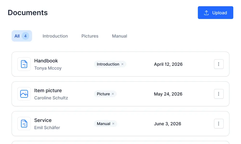 Each item has its own digital storage, where all relevant documents—such as manuals, maintenance logs, or warranties—can be securely saved.