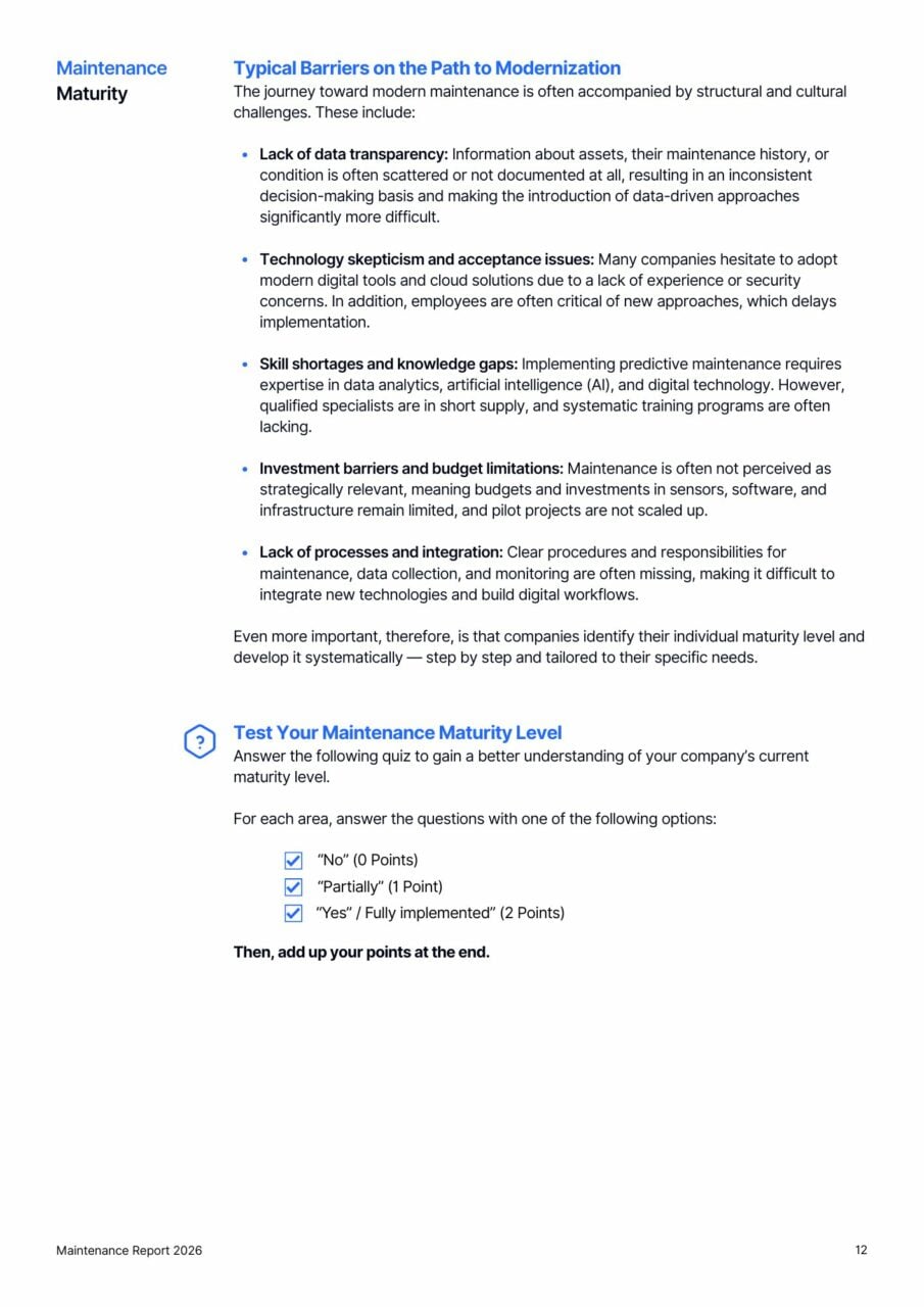 The report includes an exclusive maturity model with 4 levels — from reactive “firefighting” mode to AI-powered, predictive maintenance. Readers can instantly test their own status.