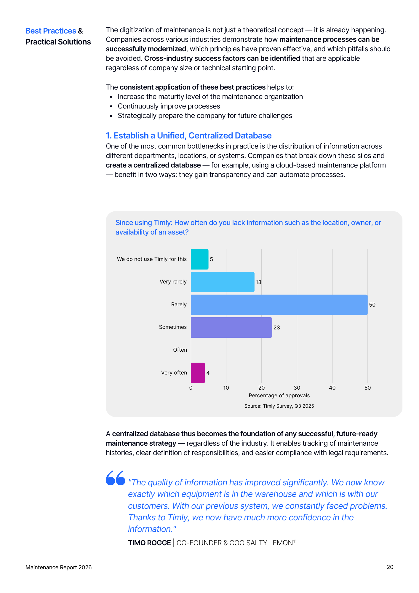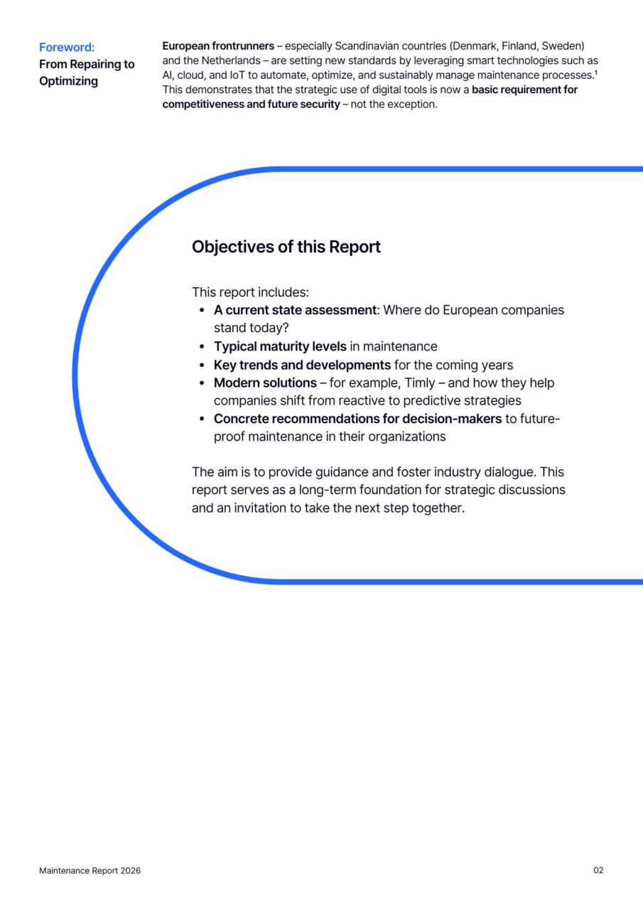 Companies across Europe are facing a turning point: the shortage of skilled workers, aging assets, rising cost pressures, and new ESG regulations are fundamentally transforming the requirements for maintenance and operations. The Maintenance Report 2026 provides the first comprehensive overview of how European companies are mastering this transformation — featuring real best practices, exclusive data from Timly surveys, and insights from leading industry experts.
