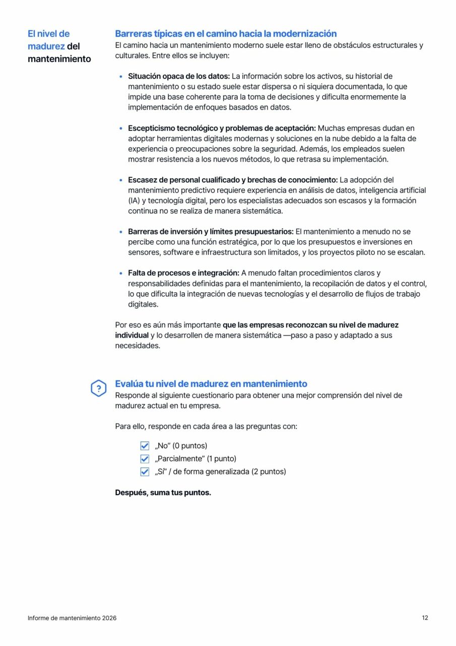 El informe incluye un modelo exclusivo de nivel de madurez del mantenimiento con 4 niveles, desde el modo reactivo “extinción de incendios” hasta el mantenimiento predictivo asistido por IA. ¡Evalúa ahora el nivel de madurez del mantenimiento de tu empresa!