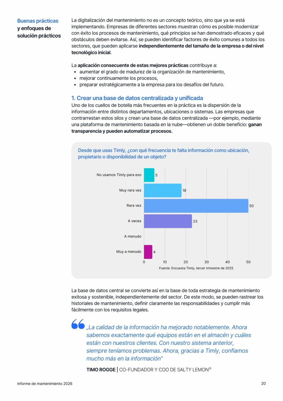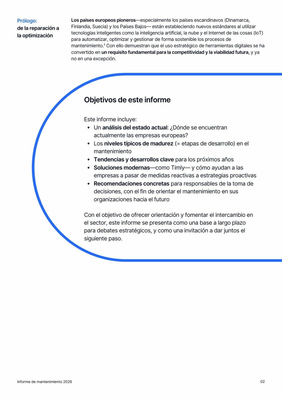 Las empresas de toda Europa se enfrentan a un punto de inflexión: la escasez de talento, el envejecimiento de los equipos, la presión de costes y las nuevas normativas ESG están transformando las exigencias de mantenimiento y operación. El Informe de mantenimiento 2026 analiza por primera vez de forma integral cómo las empresas europeas afrontan esta transformación, con casos de éxito reales, datos exclusivos de las encuestas de Timly y perspectivas de los principales expertos del sector.