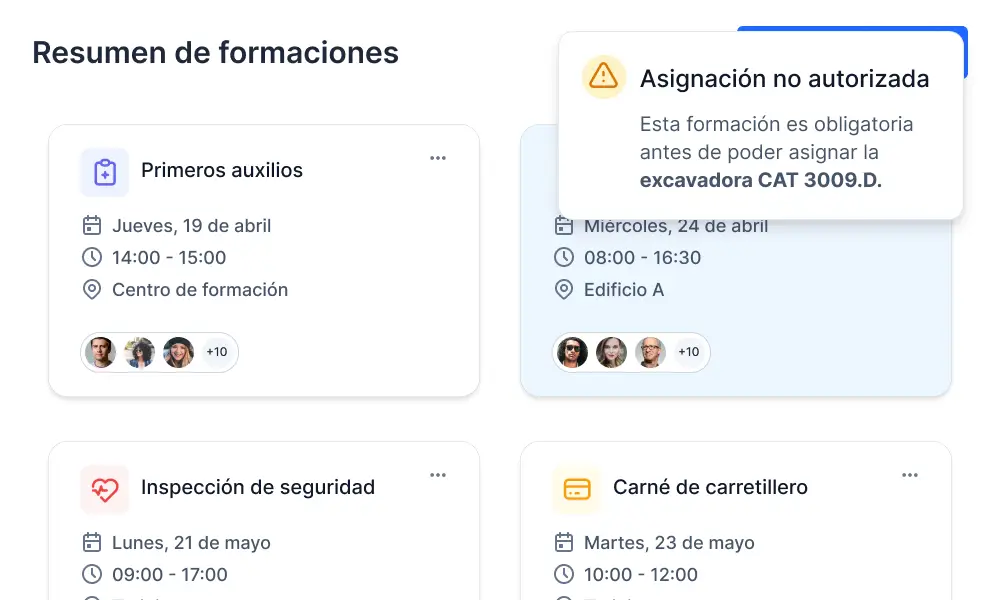 Sí. Con Timly gestionas de forma centralizada las formaciones, cualificaciones e instrucciones de seguridad, aunque tus equipos trabajen en varias sedes o en distintos países. Detectas brechas de cualificación entre sedes, ves qué formaciones están pendientes y puedes generar informes para sedes concretas, departamentos o roles específicos.
