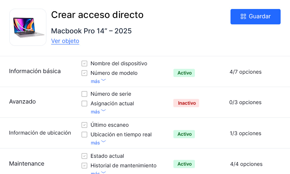 Con las etiquetas de acceso directo defines en el área de administración qué datos básicos son visibles sin inicio de sesión, por ejemplo nombre del equipo, estado, ubicación o persona de contacto, mientras que la información confidencial permanece oculta.
