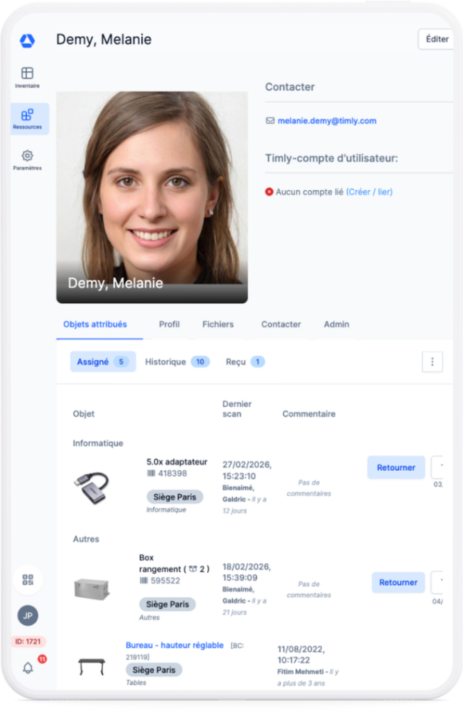 Oui, Timly couvre très bien l’inventaire des équipements, qu’il s’agisse de machines de production, d’outillage ou de matériel informatique. Le système d’inventaire centralise lieux, responsables, numéros de série, échéances de maintenance et cycle de vie de chaque actif.