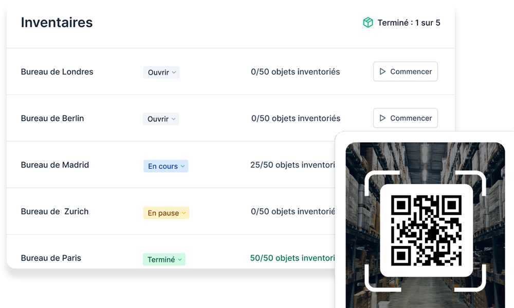 Planifiez vos campagnes d’inventaire de manière centralisée, attribuez les tâches aux bons sites et aux bonnes équipes, et suivez le statut de chaque inventaire en ligne dans votre tableau de bord.