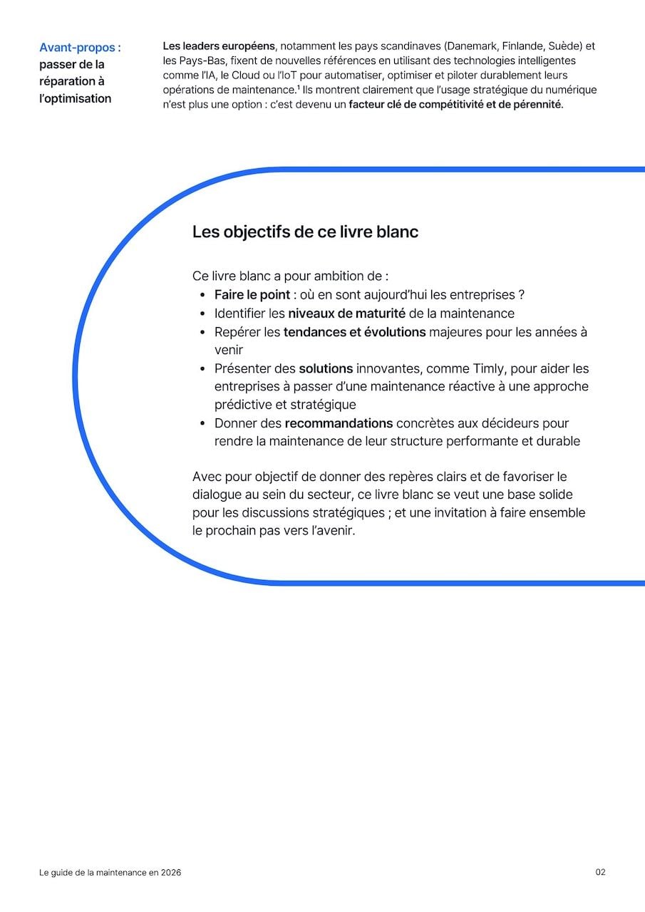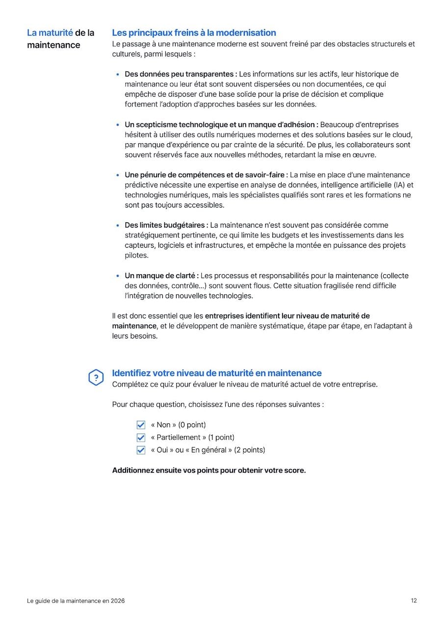 Ce guide inclut un modèle de maturité à 4 niveaux, allant de la maintenance réactive « en mode pompiers » à la maintenance prédictive assistée par intelligence artificielle. Vous pouvez évaluer votre niveau de maintenance directement dans ce guide.
