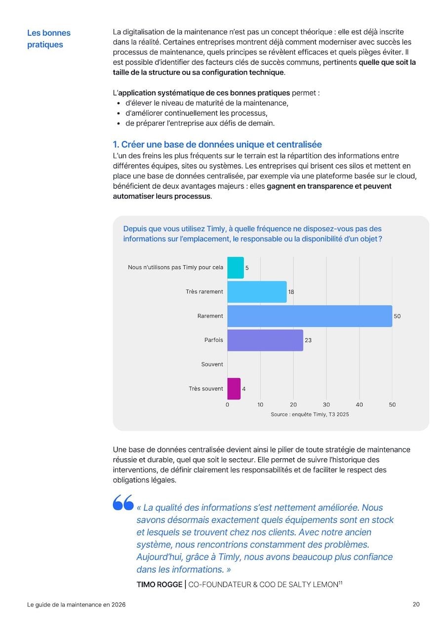 Les entreprises européennes traversent une période de transformation majeure. Pénurie de talents, équipements vieillissants, pression sur les coûts et nouvelles obligations ESG transforment les pratiques de maintenance. Ce guide propose, pour la première fois de manière exhaustive, une analyse des stratégies que ces entreprises déploient pour relever ces défis, en s’appuyant sur des bonnes pratiques éprouvées, des données issues d’enquêtes Timly et les insights d’experts du secteur.