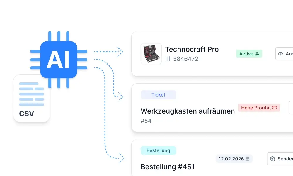 Timly AI vereint moderne KI‑Unterstützung in drei zentralen Funktionsbereichen, damit Datenpflege, Import und Wartung schneller, konsistenter und intelligenter ablaufen als je zuvor.